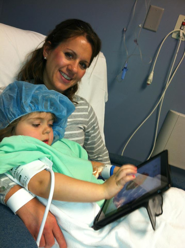 Here we are pre op. She was making "cupcakes" on a game on John's iPad. The poor thing had not eaten or drunken anything that day - I don't know how she was doing it. She had to have been so hungry (lol)!